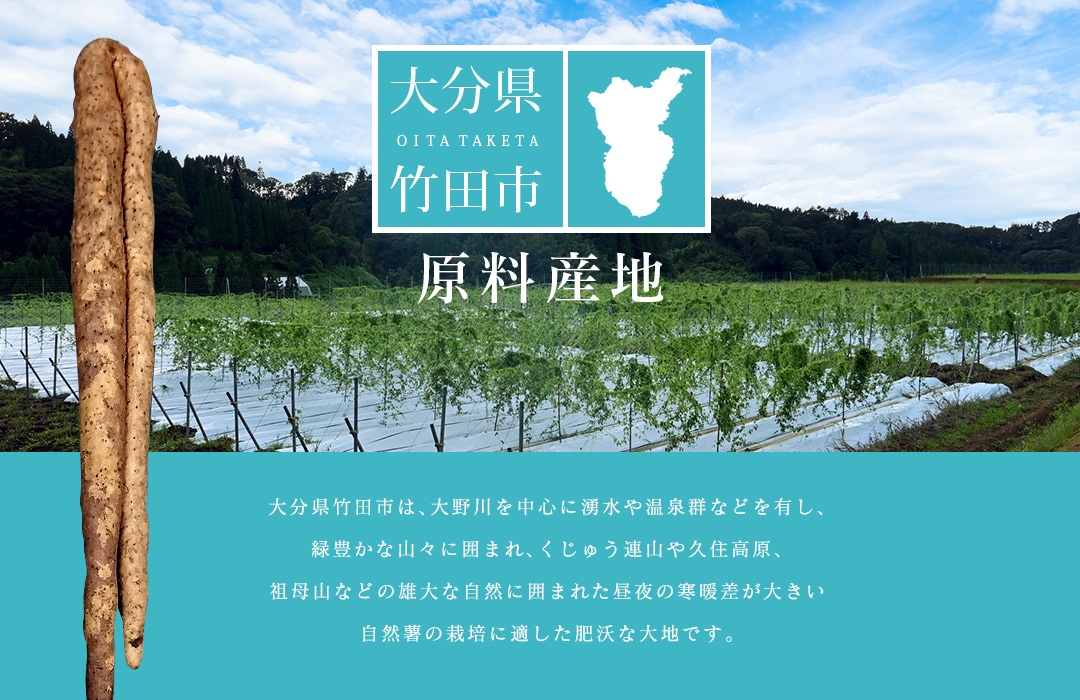 原料の自然薯は、大分県竹田市の市認定農家が、堆肥づくり、土壌づくりから栽培、収穫まで、丹精込めて生産しています。