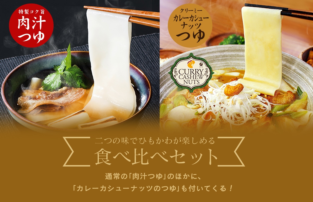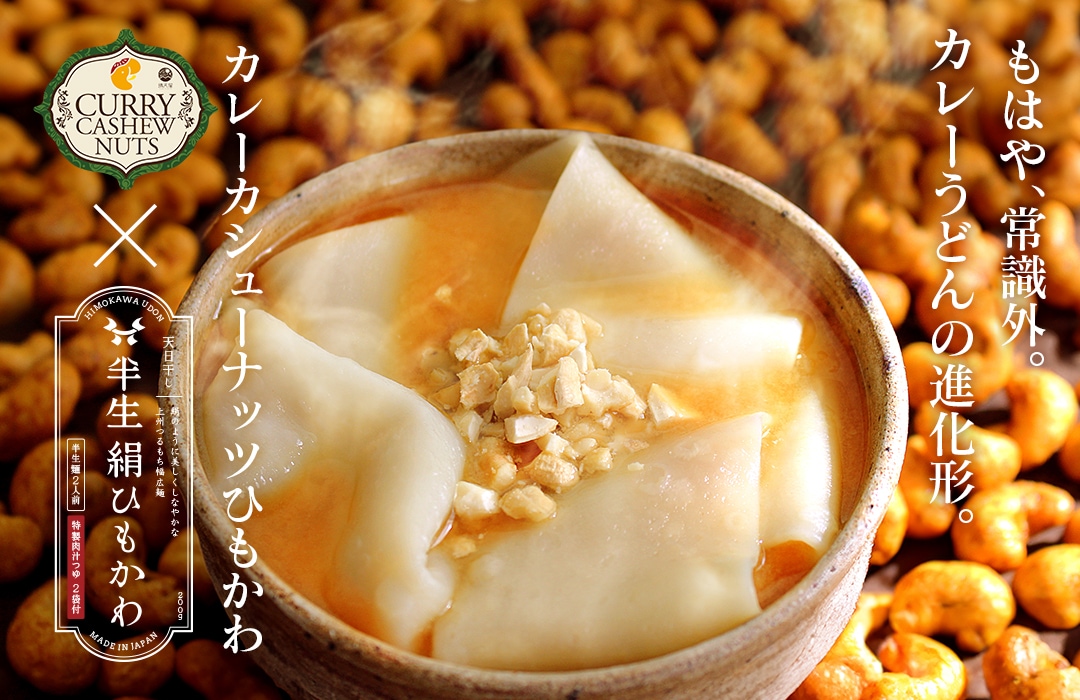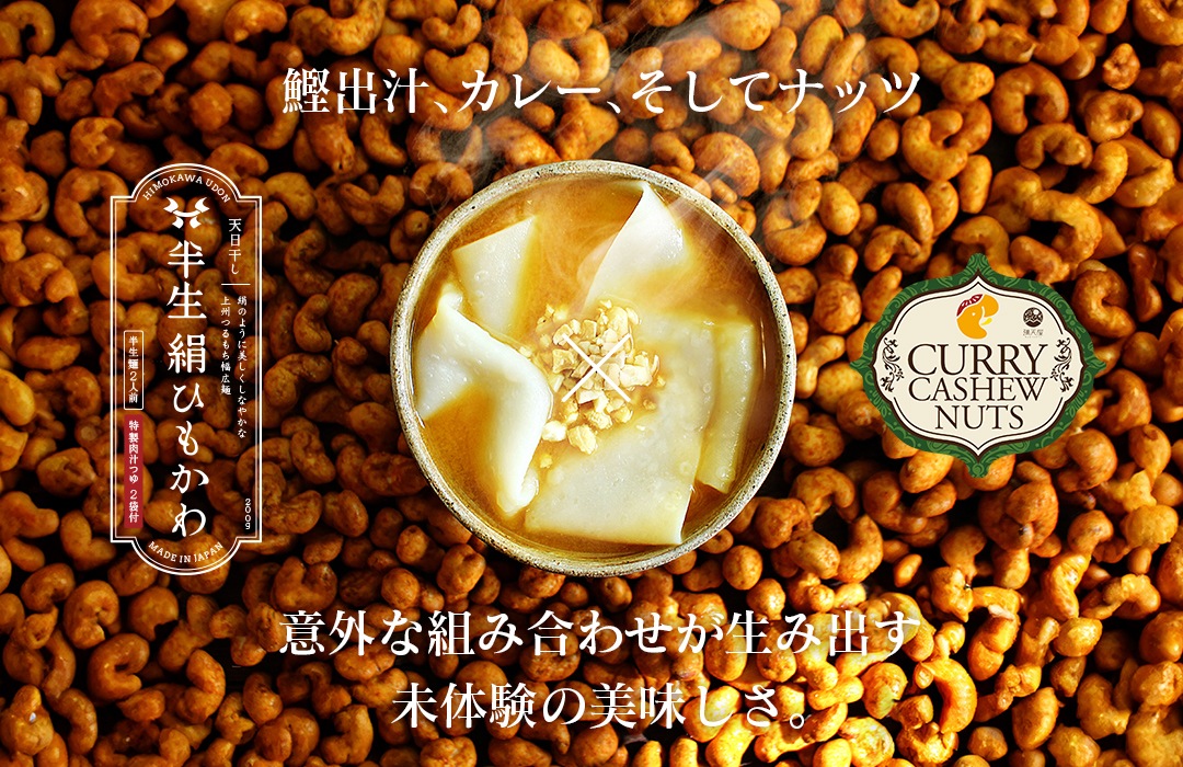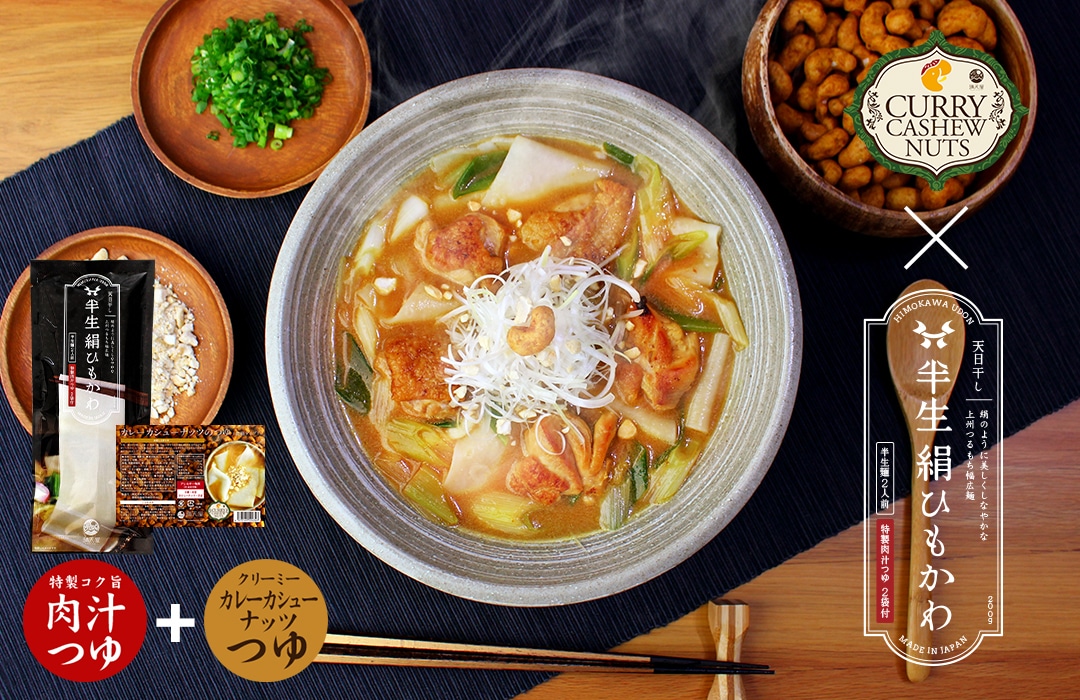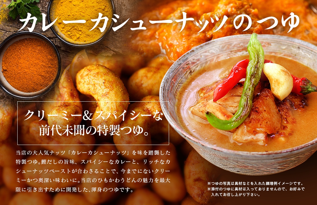 鰹だしの風味、スパイスを効かせたカレーと、リッチなカシューナッツペーストが合わさることで、つゆは極限までクリーミー&超濃厚に。ひもかわの平たい麺に驚くほど絡むこだわりのオリジナルつゆです。