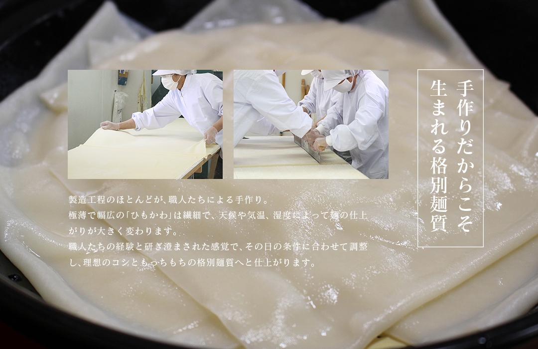 手間はかかりますが、伝統の製法を大切にしながら、職人の手によって、一本一本丁寧に美味しい「ひもかわ」がつくられています。