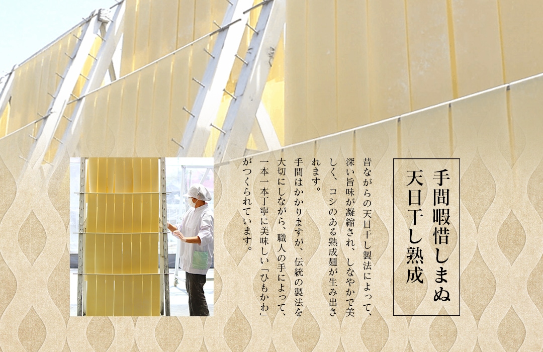 昔ながらの天日干し製法によって、深い旨味が凝縮され、しなやかで美しく、コシのある熟成麺が生み出されます。