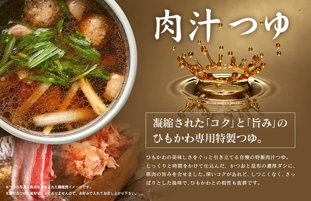 ひもかわの美味しさをぐっと引き立てる自慢の特製肉汁つゆ。