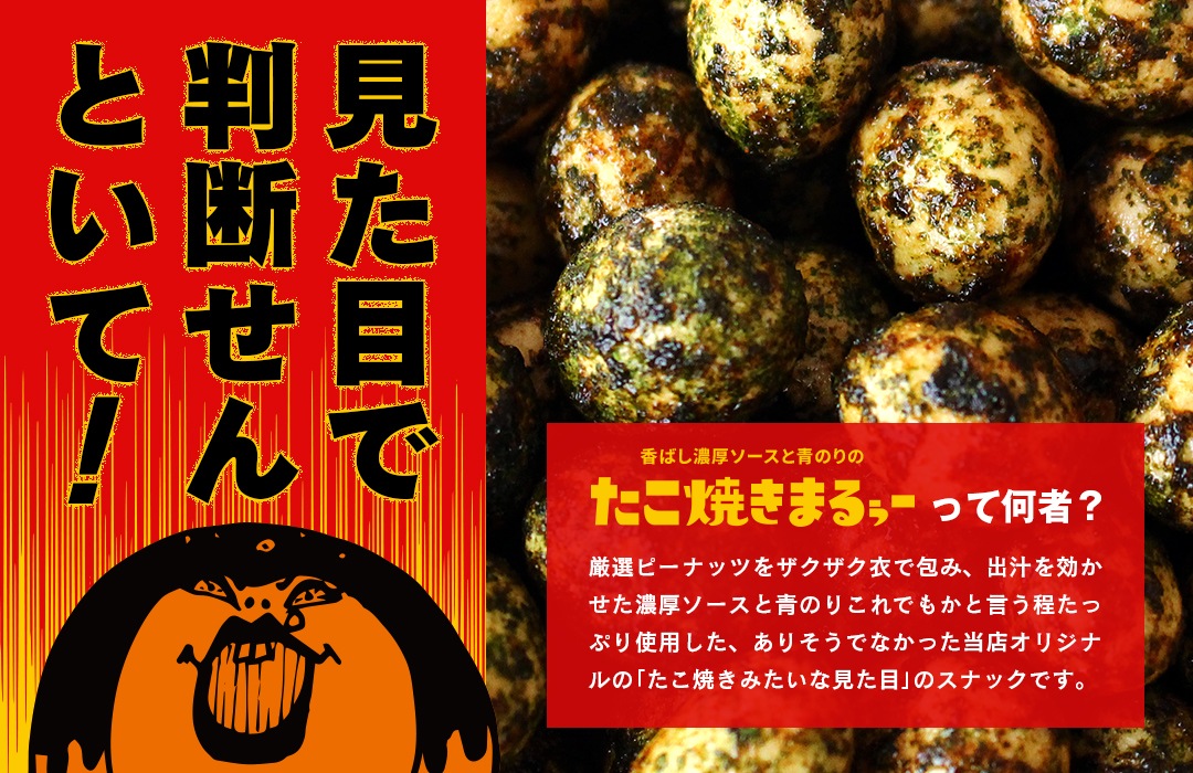 厳選ピーナッツをザクザク衣で包み、出汁を効かせた濃厚ソースと青のりこれでもかと言う程たっぷり使用したありそうでなかった当店オリジナルの「たこ焼きみたいな見た目」のスナックです。
