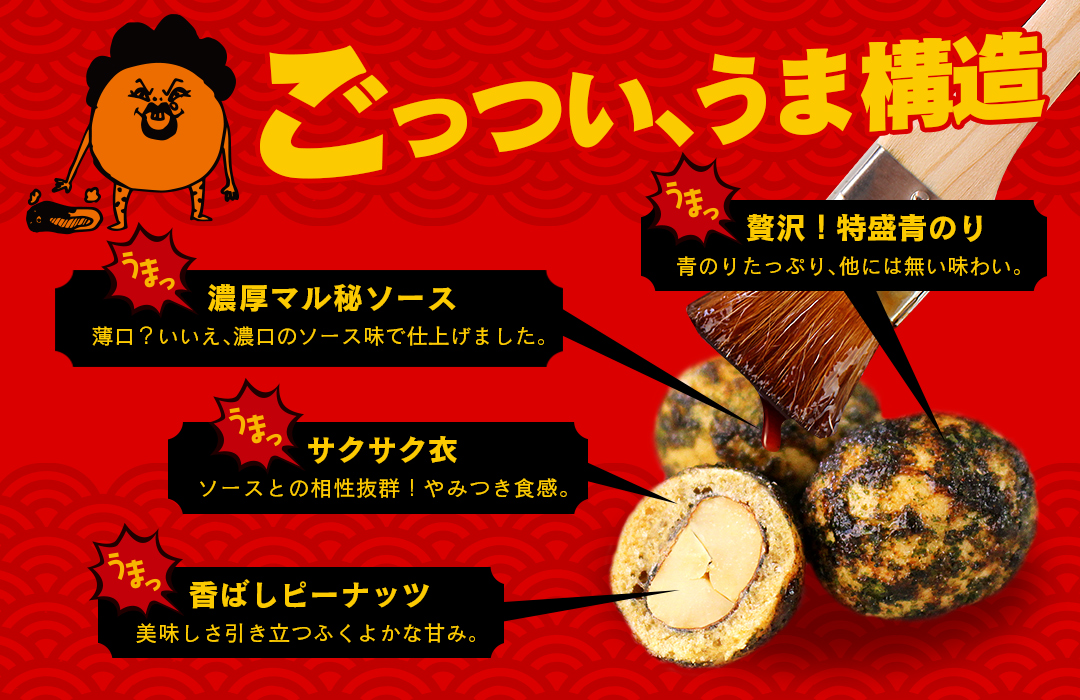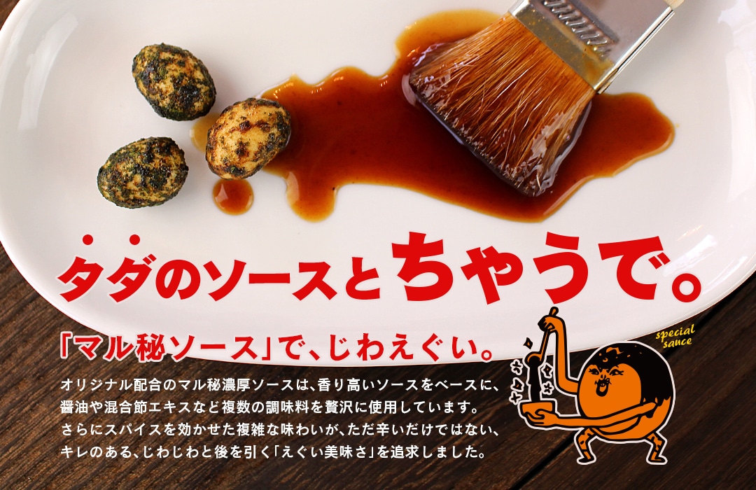 オリジナル配合のマル秘濃厚ソースは、香り高いソースをベースに、醤油や混合節エキスなど複数の調味料を贅沢に使用しています。