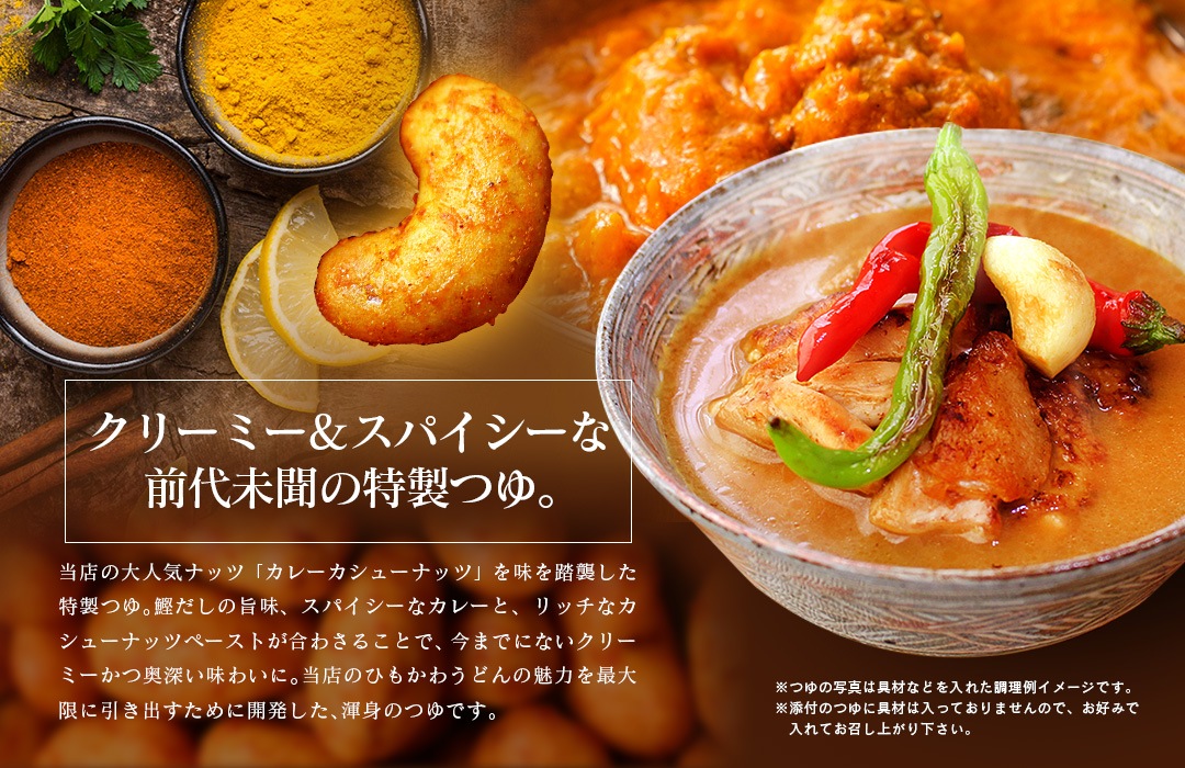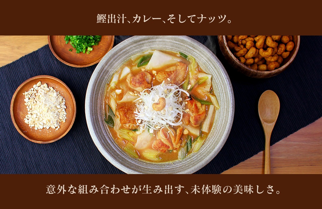 鰹だしの風味、スパイスを効かせたカレーと、リッチなカシューナッツペーストが合わさることで、つゆは極限までクリーミー&超濃厚に。