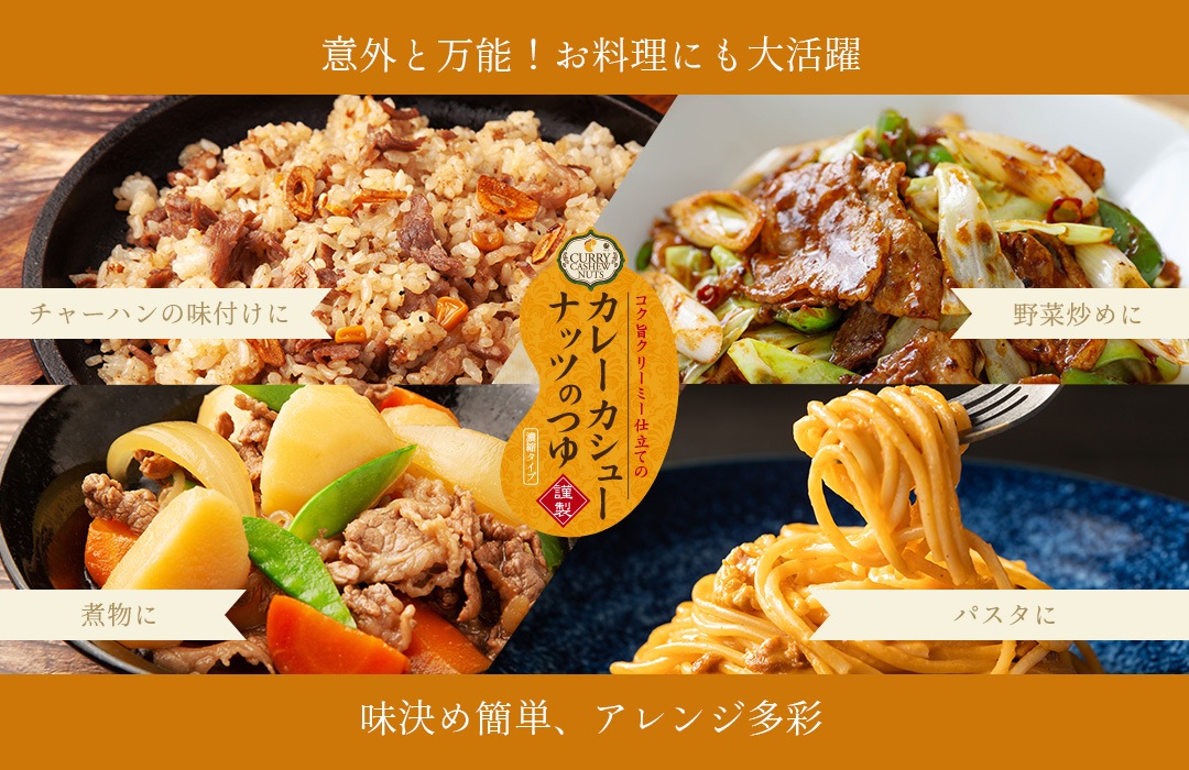 しょうゆ(国内製造)、砂糖、カレーカシューナッツペースト、食塩、発酵調味料、節(かつお、うるめ、さば、宗田かつお)、カレーパウダー、かつお節エキス/調味料(アミノ酸等)、酒精、カラメル色素、酸味料、V.B₁、増粘剤(キサンタン)、(一部に大豆、小麦、カシューナッツ、さばを含む)